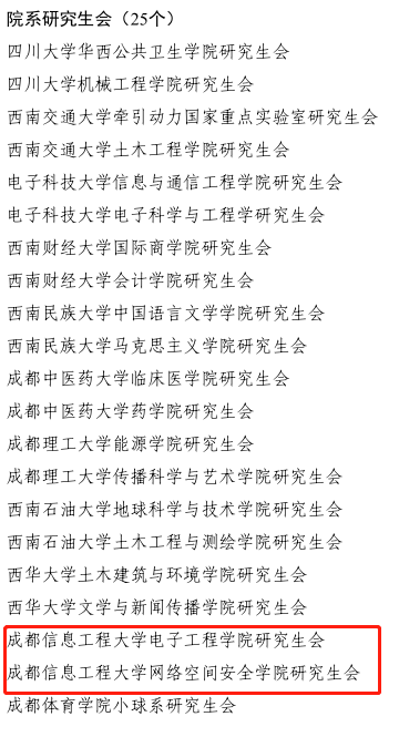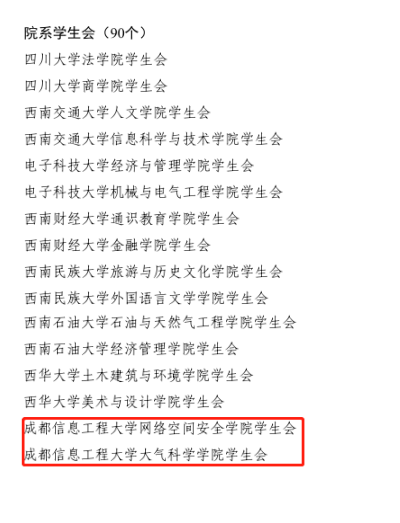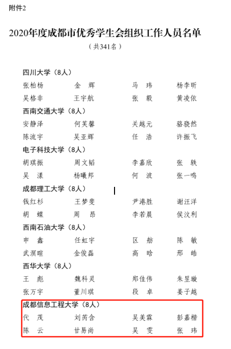 【本网讯】近日,成都市学生联合会下发了《成都市学生联合会关于表扬2020年成都市优秀学生会组织、优秀学生会组织工作人员的通报》,表彰在蓉高校学生会(研究生会)、直属中学(中职)学生会。伟德官网学生会、研究生会分别荣获“2020年成都市优秀校级学生会”和“2020年成都市优秀校级研究生会”;伟德官网大气科学学院学生会、网络空间安全学院会、电子工程学院研究生会、网络空间安全学院研究生会分别荣获“2020年成都市优秀院级学生会组织称号”;伟德官网文化艺术学院陈云、网络空间安全学院甘易尚、大气科学学院吴雯、物流学院张玮、通信工程学院研究生代茂、吴美霖,管理学院研究生刘芮含、软件工程学院研究生彭嘉楷荣获“2020年度成都市优秀学生会组织工作人员”。