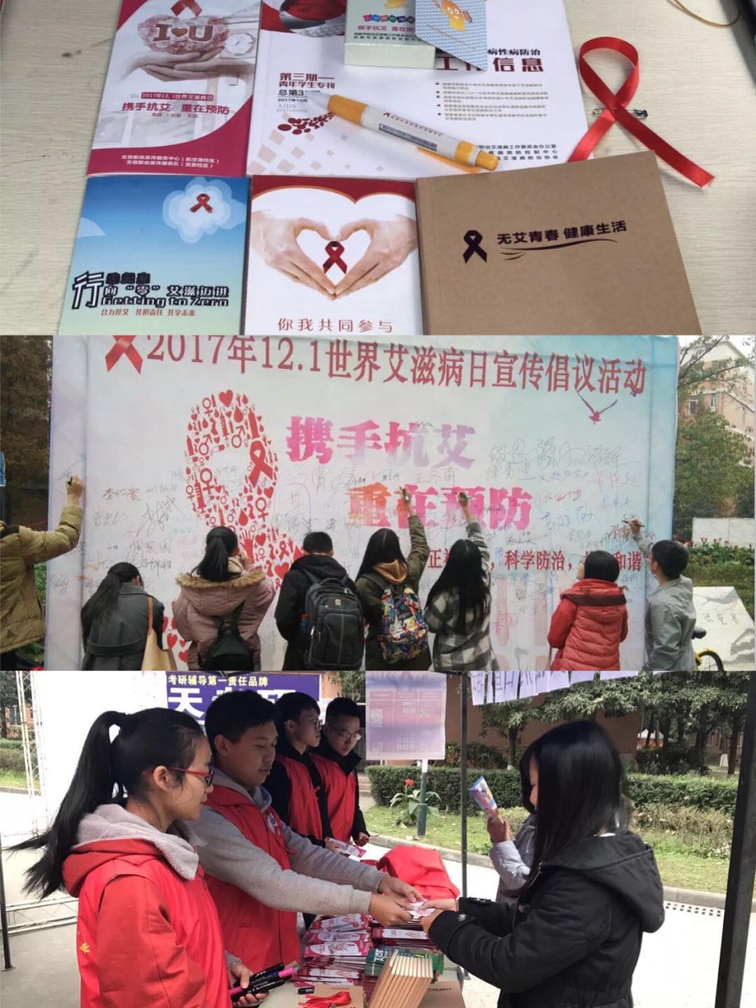 【本网讯】12月1日是第30个“世界艾滋病日”。当天上午,学校分别在航空港和龙泉校区举行2017年世界艾滋病日“携手防艾,重在预防”主题宣传倡议活动。校团委、校卫生防疫保健中心有关负责人以及伟德官网志愿者参加了活动。