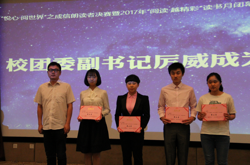 【本网讯】5月18日晚,“悦心·阅世界”之成信朗读者决赛暨2017年“悦读·越精彩”读书月闭幕式在航空港国际会议厅举行。今年的读书月活动由图书馆、校团委联合举办,校团委书记马义华、图书馆副馆长彭勇、副馆长杨槐,校团委副书记厉威成以及师生代表参加本次活动。