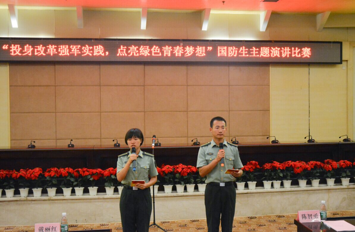 本次比赛由驻校选培办和学生工作处联合举办,学生工作处负责人、相关学院党总支书记,火箭军驻校选培办及学生工作处相关老师参加演讲比赛并担任评委,全体国防生与会。在校学员踊跃报名,紧紧围绕“我有一个强军梦”、“无悔青春献国防”这两个主题,或从自己的成长历程出发,用自己的青春感悟阐释自己对于改革强军的认识;或从军人的使命感和责任感出发,强调现在的幸福生活来之不易。不同于以往,本次主题演讲比赛还特别针对原创演讲稿进行评审,评选出了优秀演讲稿,意在鼓励原创精神,促进在校学员提升写作水平。