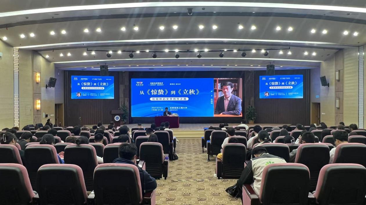 10月16日晚,“名家天府行”作家讲座在学校国际会议厅举行。中国作家协会会员、百花文学奖获得者、著名小说家、散文家杜阳林先生以“从《惊蛰》到《立秋》:杜阳林的文学创作之路”为题,结合自身的成长经历,讲述了文学创作和生活实践中苦难砥砺、破茧成蝶,实现认知飞跃和生命突围的励志故事。现场师生与杜阳林先生开展了交流互动,氛围热烈。