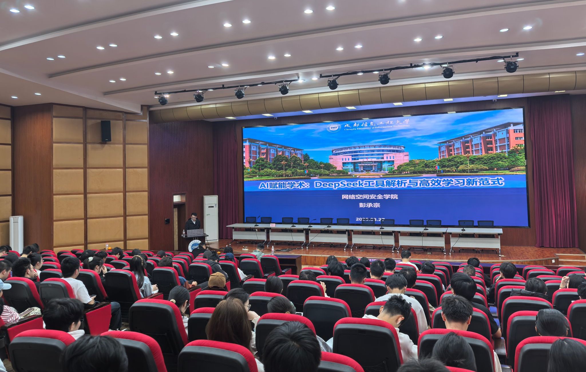 【本网讯】为贯彻落实党和国家关于人工智能发展的战略部署,特别是习近平总书记关于“加快人工智能人才培养”“推动教育数字化战略”的重要指示精神,3月13日和27日,学校党委学生工作部分别在航空港校区和龙泉校区,邀请网络空间安全学院彭承宗副教授,作题为“AI赋能学术:DeepSeek工具解析与高效学习新范式”的专题讲座,500余名本科学生现场参与,共同探索人工智能技术在科研与学习中的创新应用。