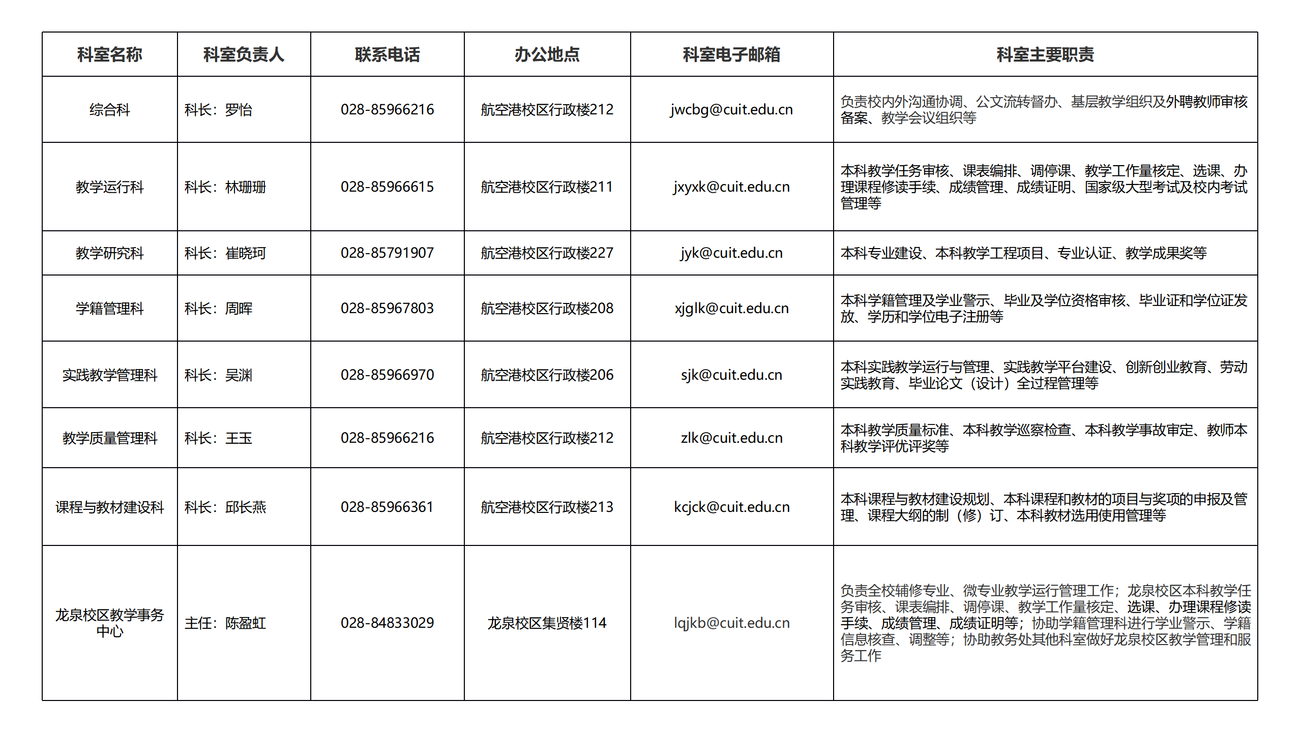 教务处负责学校全日制普通本科教育教学计划、教学运行、实践教学、创新创业教育、课程与教材建设、教学研究与改革、教学质量等方面的管理与服务,下设有综合科、教学运行科、教学研究科、学籍管理科、实践教学管理科、教学质量管理科、课程与教材建设科、龙泉校区教学事务中心共8个业务科室。教务处在航空港校区(行政楼二楼)、龙泉校区(集贤楼一楼)分设办公场所,为全校师生提供一站式的教学集中服务。