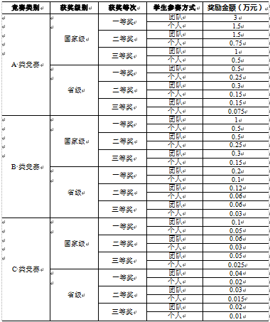 3.获奖等次设置为金奖、银奖、铜奖的竞赛,其奖励标准为:金奖、银奖、铜奖分别对应上表中的一等奖、二等奖、三等奖执行。